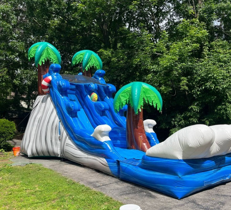 Bring the beach vibes to your backyard with the 17' Malibu Single Lane Water Slide! Standing tall with vibrant tropical colors and palm tree accents, this slide delivers the perfect mix of thrills and chill for any summer event.
