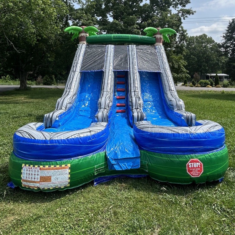 Paradise Falls is a 16-foot tropical water slide available for rent in Murfreesboro, TN and surrounding areas, bringing double-lane racing excitement and refreshing splashdown fun to backyard parties and community events across Rutherford County.